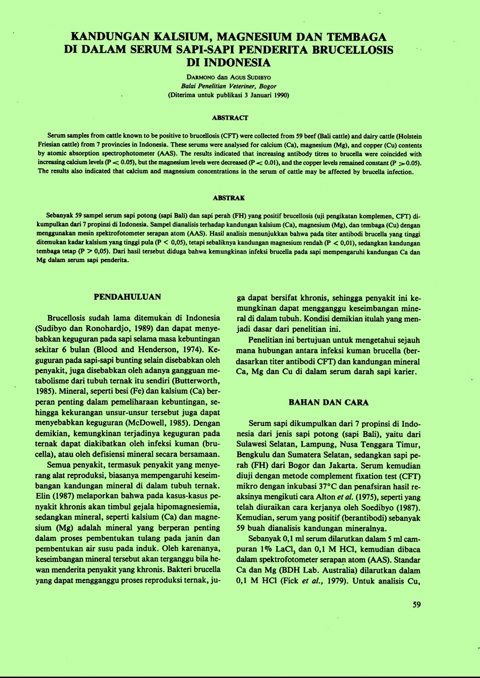 | Judul | Kandungan kalsium, magnesium dan tembaga di dalam serum sapi-sapi penderita brucellosis di Indonesia. / Darmono; Sudibyo, Agus(Balai Penelitian Veteriner, Bogor (Indonesia)). |