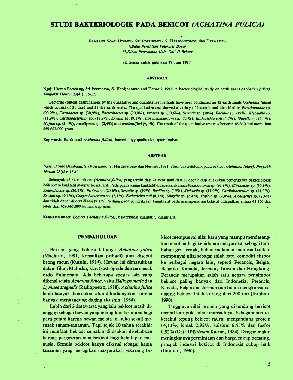 | Judul | Studi bakteriologik pada bekicot (achatina fulica). / Utomo, Bambang Ngaji; Poernomo, Sri; Hardjoutomo, Suprodjo(Balai Penelitian Veteriner, Bogor (Indonesia))Herwati (Dinas Peternakan Kab. Bati II Bekasi(Indonesia)). |