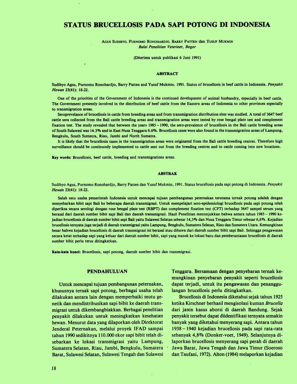 | Pengarang | Ronohardjo, Purnomo Patten, Barry Mukmin, Yusuf(Balai Penelitian Veteriner, Bogor (Indonesia)). |