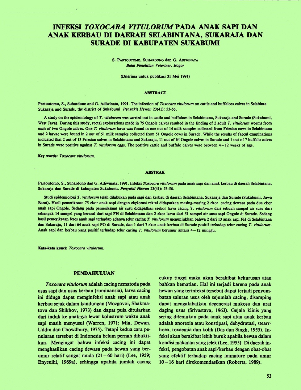 | 245 | # | # | $a Infeksi Toxocara vitulorum pada anak sapi dan anak kerbau di daerah Selabintana, Sukaraja dan Surade di Kabupaten Sukabumi. /$c Partoutomo, Sutijono; Suhardono; Adiwinata, Gatot(Balai Penelitian Veteriner, Bogor (Indonesia)). |