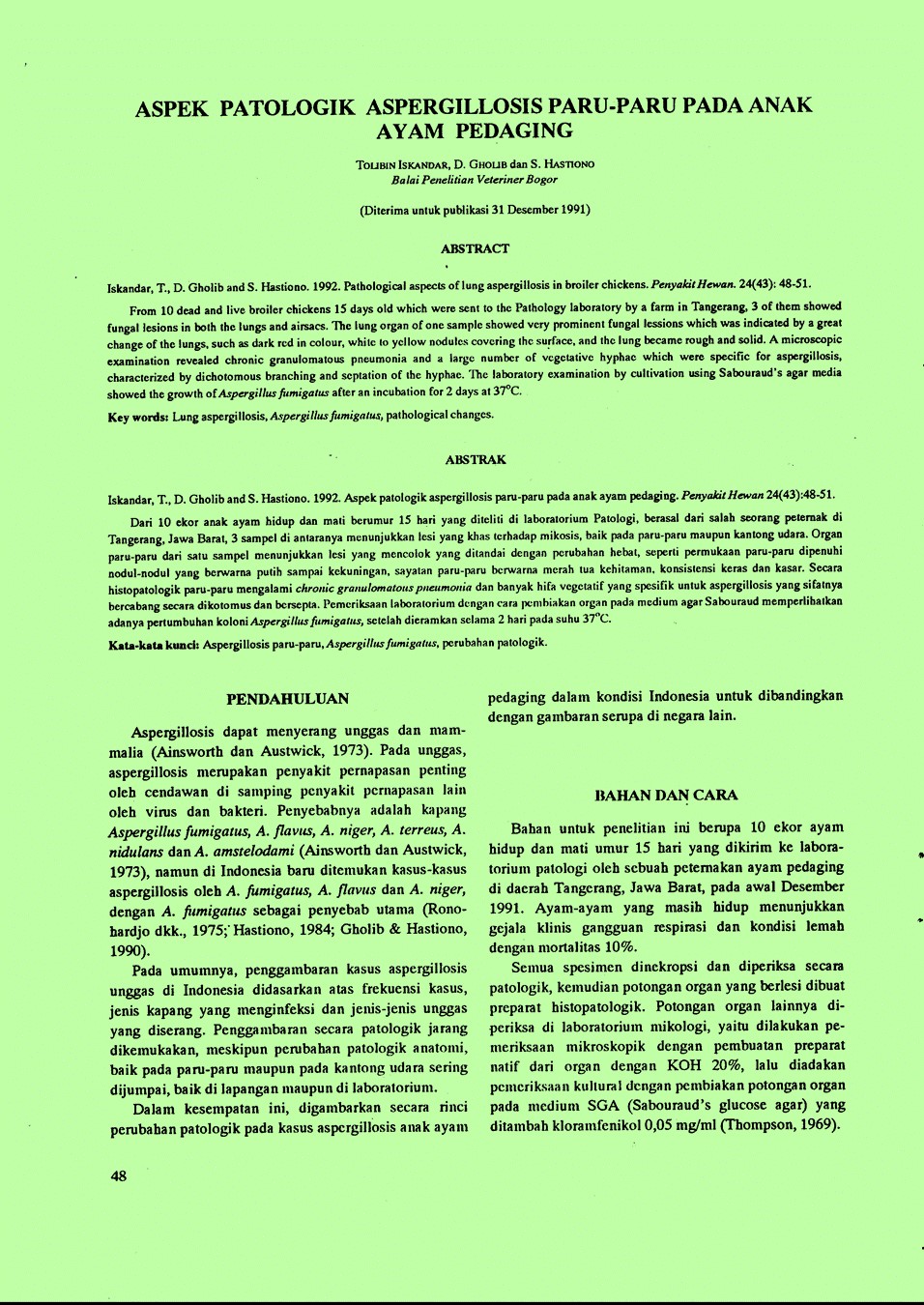| Judul | Aspek patologik Aspergillosis paru-paru pada anak ayam pedaging. / Iskandar, Tolibin; Gholib, Djaenudin; Hastiono, Sukardi(Balai Penelitian Veteriner, Bogor (Indonesia)). |