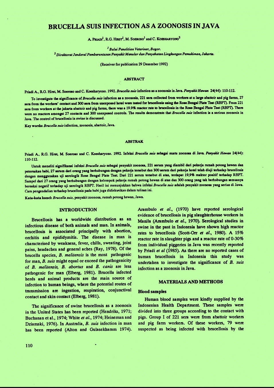 | Judul | Brucella suis infection as a zoonosis in Java. / Priadi, Adin; Hirst, Ribert G.; Soeroso, Moch(Balai Penelitian Veteriner, Bogor (Indonesia))Koesharjono, C. (Direktorat Jenderal Pembeantasan Penyakit Menular san Penyehatan Lingkungan Pemukiman, Jakarta (Indonesia)). |