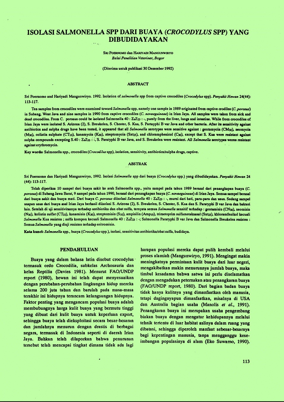 | Judul | Isolasi Salmonella spp dari buaya (Crocodylus spp) yang dibudidayakan. / Poernomo, Sri; Mangunwiryo, Hariyadi(Balai Penelitian Veteriner, Bogor (Indonesia)). |