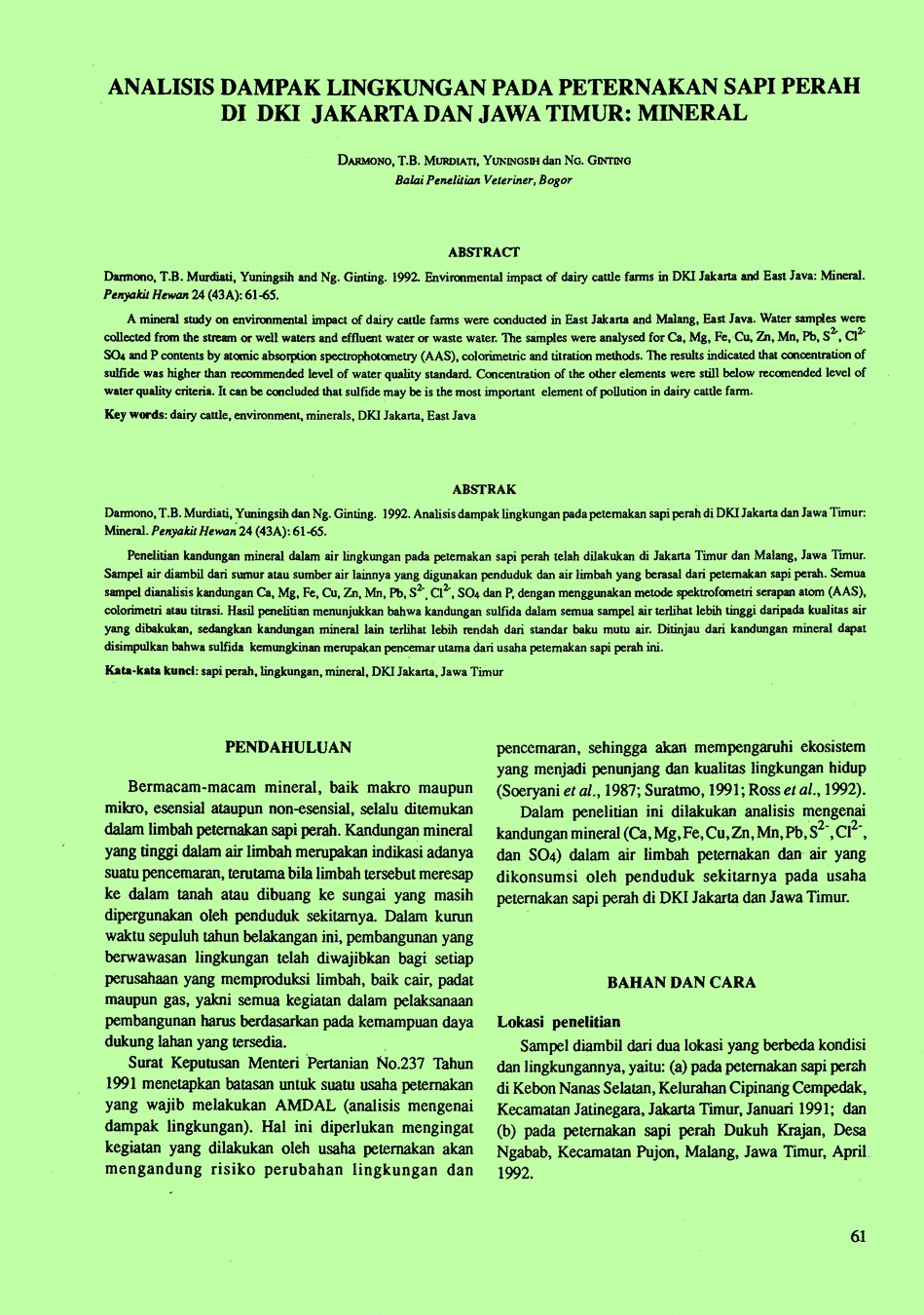 | Judul | Analisis Dampak Lingkungan pada Peternak Sapi Perah di DKI Jakarta dan Jawa Timur: Mineral / Darmono; Murdiati, Tri Budhi; Ginting, Ngepkep (Balai Penelitian Veteriner, Bogor) |
