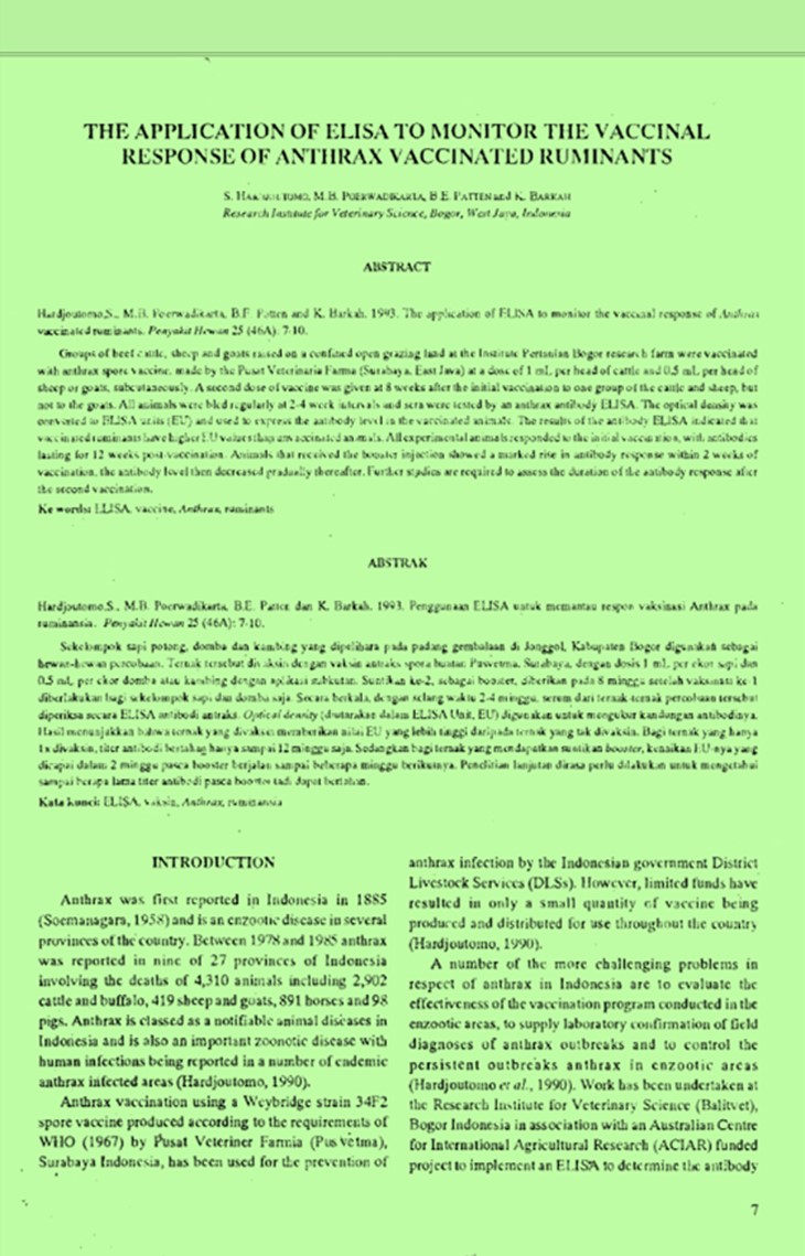 | 245 | # | # | $a The application of ELISA to monitor the vaccinal response of anthrax vaccinated ruminants /$c Hardjoutomo, Suprodjo; Poerwadikarta, M. Bhakti; Patten, Barry; Barkah, Koko(Balai Penelitian Veteriner, Bogor (Indonesia)). |