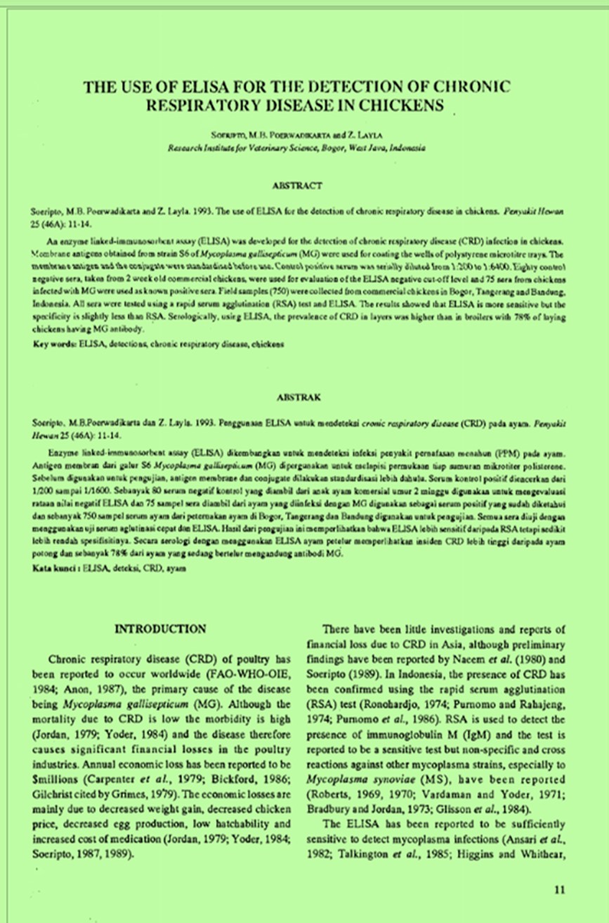 | Judul | The use of ELISA for the detection of chronic respiratory disease in chickens / Soeripto; Poerwadikarta, M. Bhakti; Layla, Z.(Balai Penelitian Veteriner, Bogor (Indonesia)). |