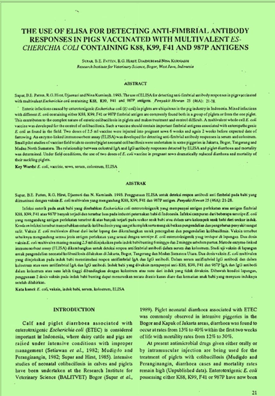 | Judul | The use of ELISA for detecting anti-fimbrial antibody responses in pigs vaccinated with multivalent Escherichia coli containing K88, K99, F41 and 987P antigens / Supar; Patten, BarryHirst, R.G.; Djaenuri; Kurniasih, Nina(Balai Penelitian Veteriner, Bogor (Indonesia)). |