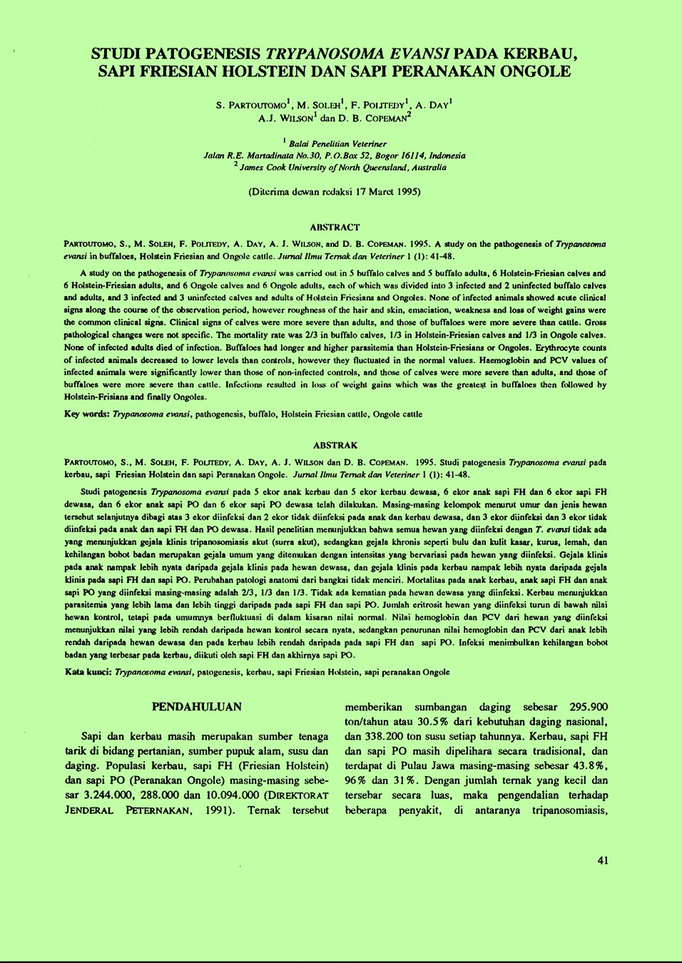 | Pengarang | Soleh, M. Politedy, F. Day, A. Wilson, A.J.(Balai Penelitian Veteriner, Bogor (Indonesia))Copeman, D.B.(James Cook University of North Queensland (Australia)). |