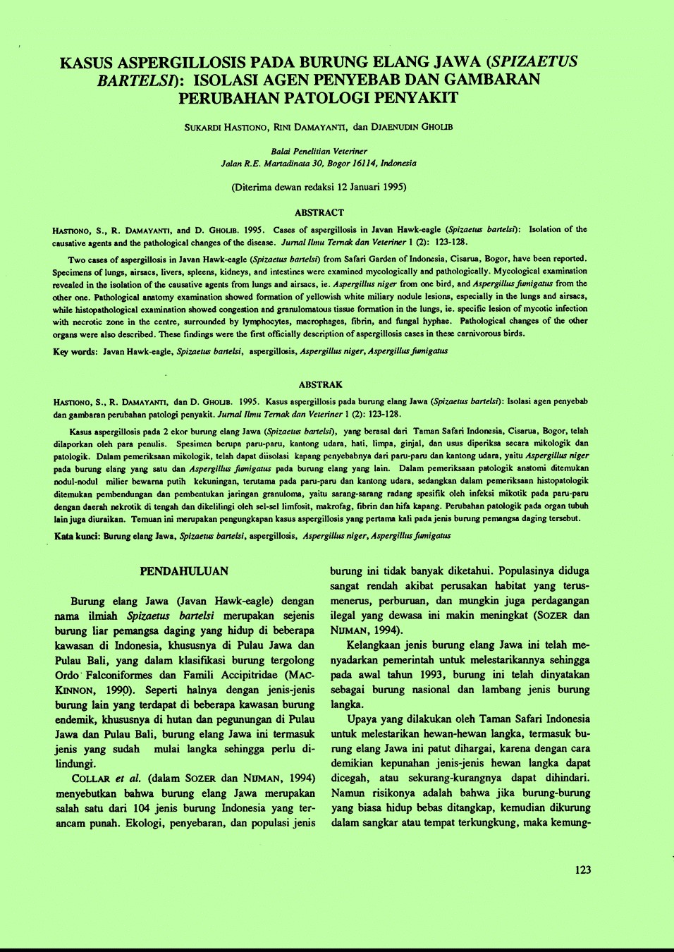 | 245 | # | # | $a Cases of aspergillosis in Javan Hawk-eagle (Spizaetus bartelsi): Kasus aspergillosis pada burung elang Jawa (Spizaetus bartelsi). /$c Hastiono, Sukardi; Damayanti, Rini; Gholib, Djaenudin(Balai Penelitian Veteriner, Bogor (Indonesia)). |