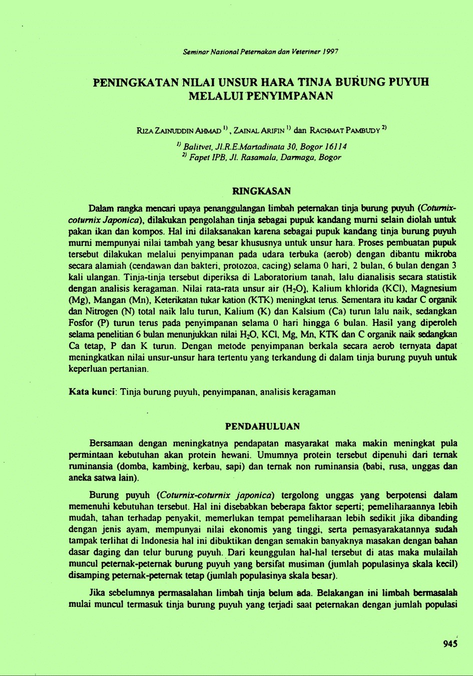 | 245 | # | # | $a Peningkatan nilai unsur hara tinja burung puyuh melalui penyimpanan. /$c Ahmad, Riza Zainuddin; Arifin, Zainal(Balai Penelitian Veteriner, Bogor (Indonesia))Pambudy, Rachmat (Fakultas Peternakan IPB, Bogor (Indonesia)). |