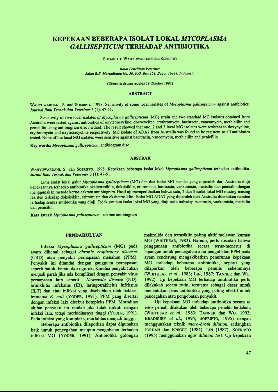 | Pengarang | Soeripto(Balai Penelitian Veteriner, Bogor (Indonesia)). |