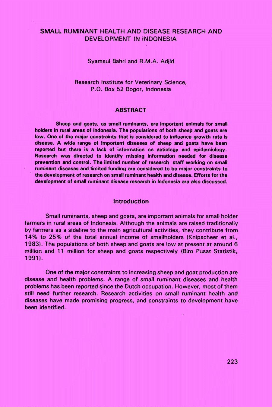 | Judul | Small ruminant health and disease research and development in Indonesia. / Bahri, Sjamsul; Adjid, R.M. Abdul (Balai Penelitian Veteriner, Bogor(Indonesia)) |
