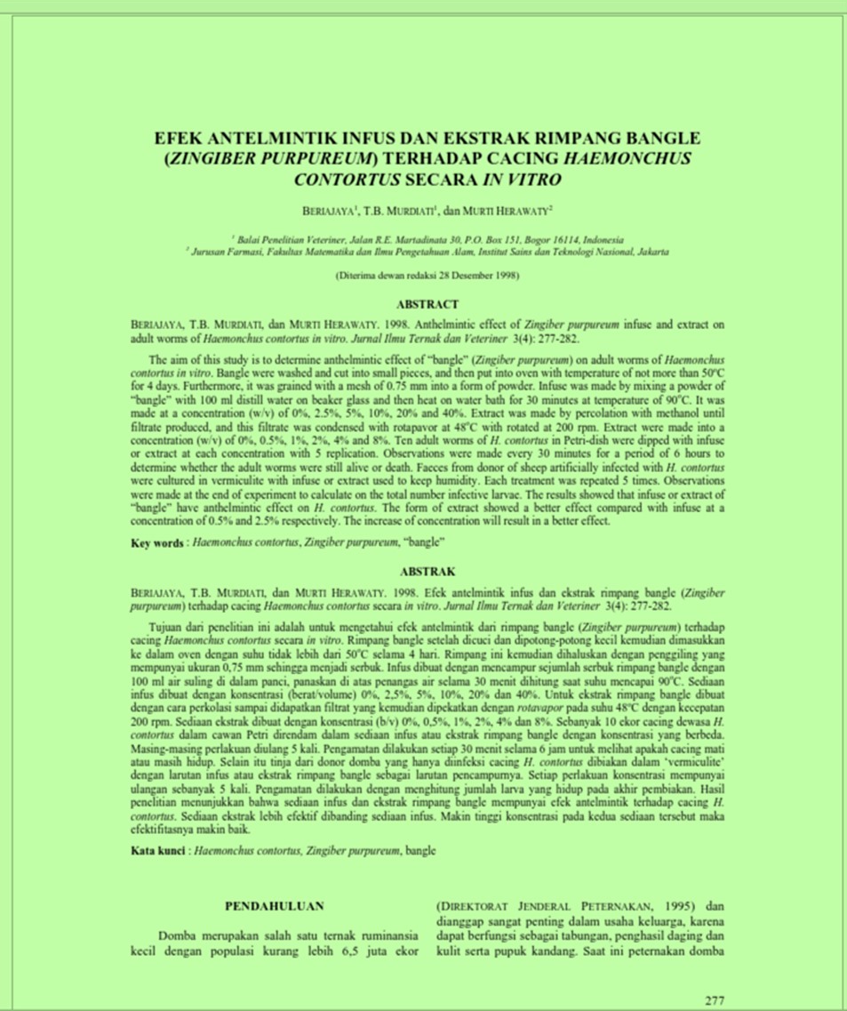 | Judul | Efek antelmintik infus dan ekstrak rimpang bangle (Zingeber purpureum) terhadap cacing Haemonchus contortus secara in vitro / Beriajaya; Murdiati, Tri Budhi(Balai Penelitian Veteriner, Bogor (Indonesia))Herawaty, Murti(Jurusan Farmasi, Fakultas Matematika dan Ilmu Pengetahuan Alam, Institut Sains dan Teknologi Nasional, Jakarta (Indonesia)). |