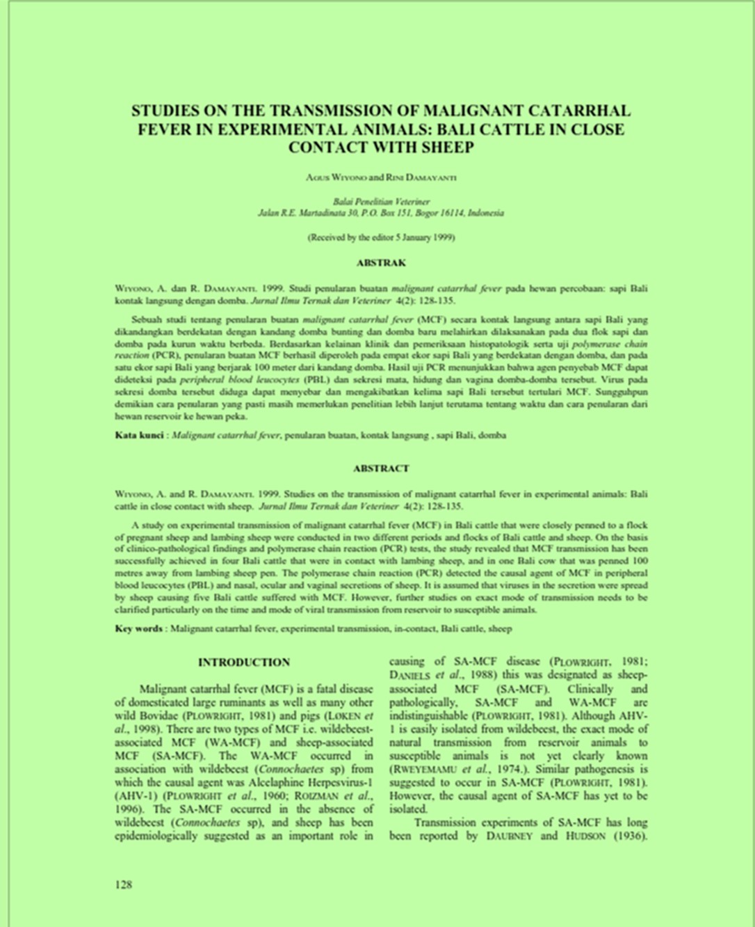 | Judul | Studies on the transmission of malignant catarrhal fever in experimental animals: Bali cattle in close contact with sheep / Wiyono, Agus; Damayanti, Rini(Balai Penelitian Veteriner, Bogor (Indonesia)). |