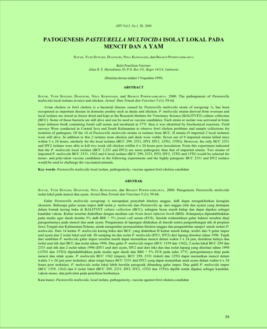 | Pengarang | Setiadi, Yudi Kurniasih, Nina Poerwadikarta, M. Bhakti(Balai Penelitian Veteriner, Bogor (Indonesia)). |