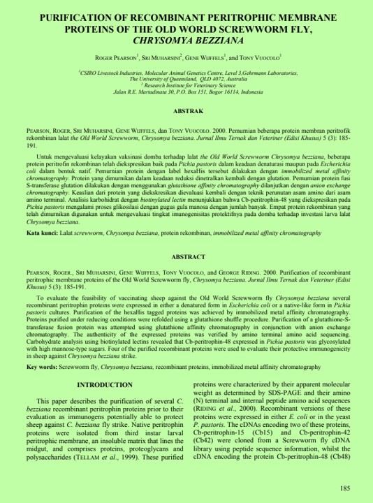 | Judul | Purification of recombinant peritrophic membrane proteins of the Old World Screwworm Fly, Chrysomya bezziana. / Pearson, Roger; Wijffels, Gene; Vuocolo, Tony(CSIRO Livestock Industries, Molecular Animal Genetics Centre, Level 3, Gehramann Laboratories, The University of Queensland, QLD 4072, Australia)Muharsini, Sri(Balai Penelitian Veteriner, Bogor (Indonesia)). |