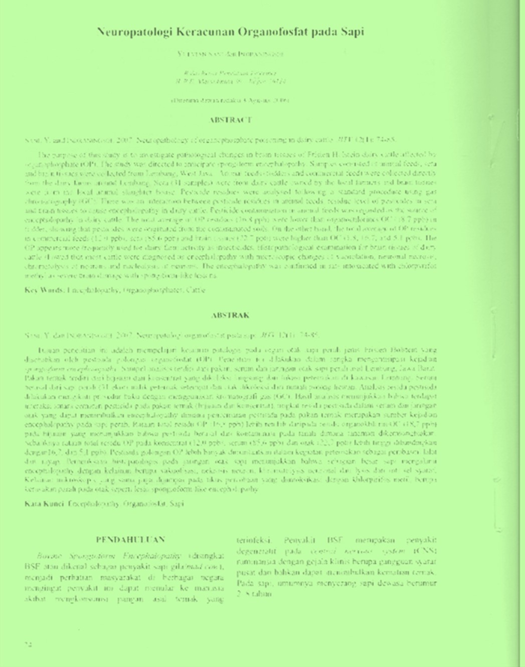 | Judul | Neuropatologi keracunan organofosfat pada sapi / Sani, Yulvian; Indraningsih(Balai Penelitian Veteriner, Bogor (Indonesia). |
