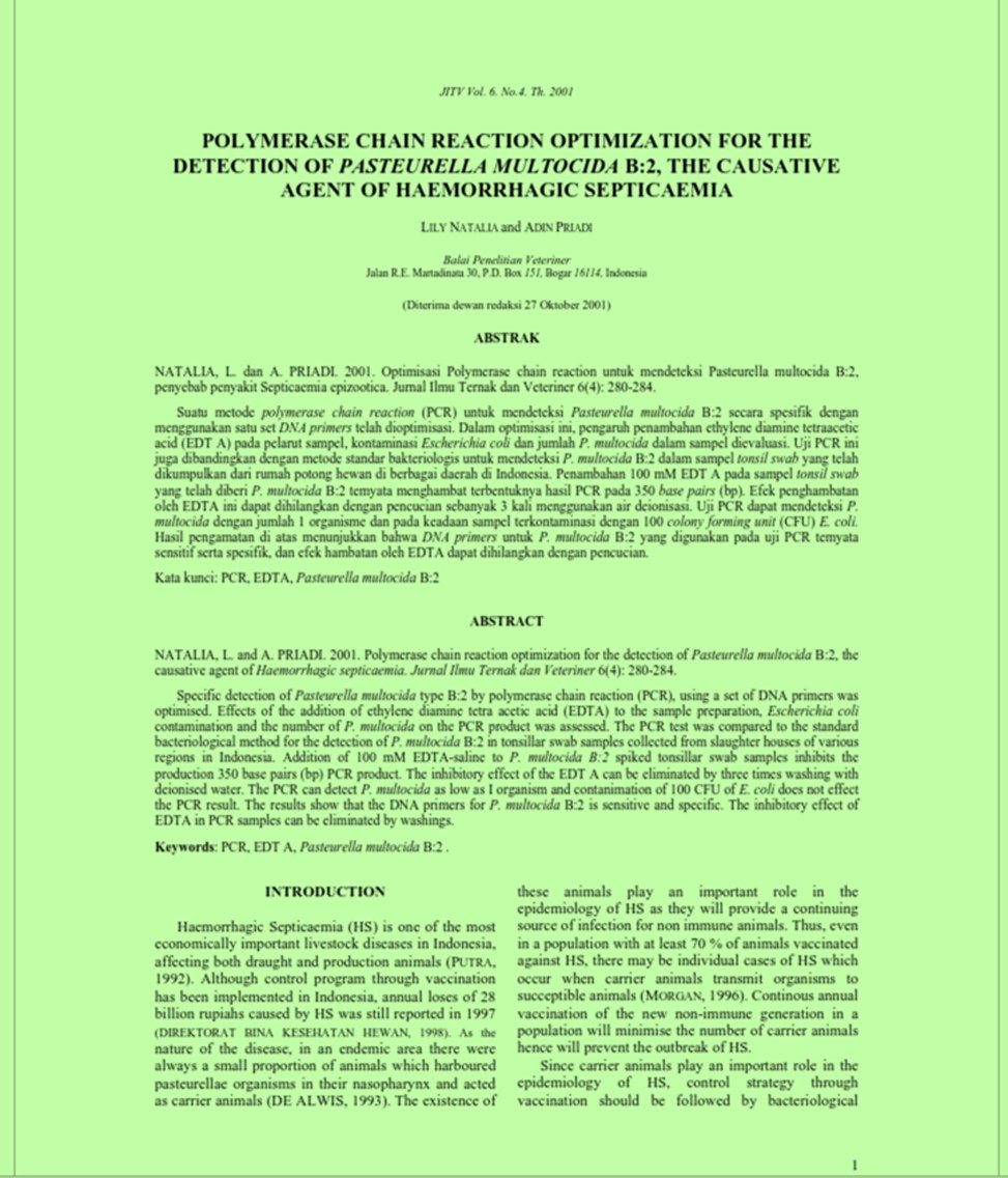| Judul | Polymerase chain reaction optimization for the detection of Pasteurella multocida B:2, the causative agent of haemorrhagic septicaemia. / Natalia, Lily; Priadi, Adin(Balai Penelitian Veteriner, Bogor (Indonesia)). |