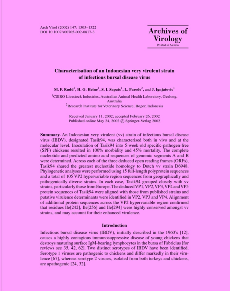 | Judul | Characterisation of an Indonesian Very Virulent Strain of Infectious Bursal Disease Virus / RUDD, M.F.; HEINE, H.G.; SAPATS, S.I.; IGNJATOVIC, J.(CSIRO Livestock Industries, Australian Animal Health Laboratory, Geelong, Australia) PAREDE, Lies (Research Institute for Veterinary Science, Bogor, Indonesia). |
