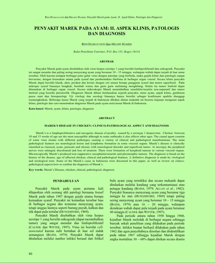| Judul | Penyakit Marek pada Ayam: II. Aspek Klinis, Patologis dan Diagnosis / Damayanti, Rini; Hamid, helmy(Balai Penelitian Veteriner, Bogor (Indonesia)). |
