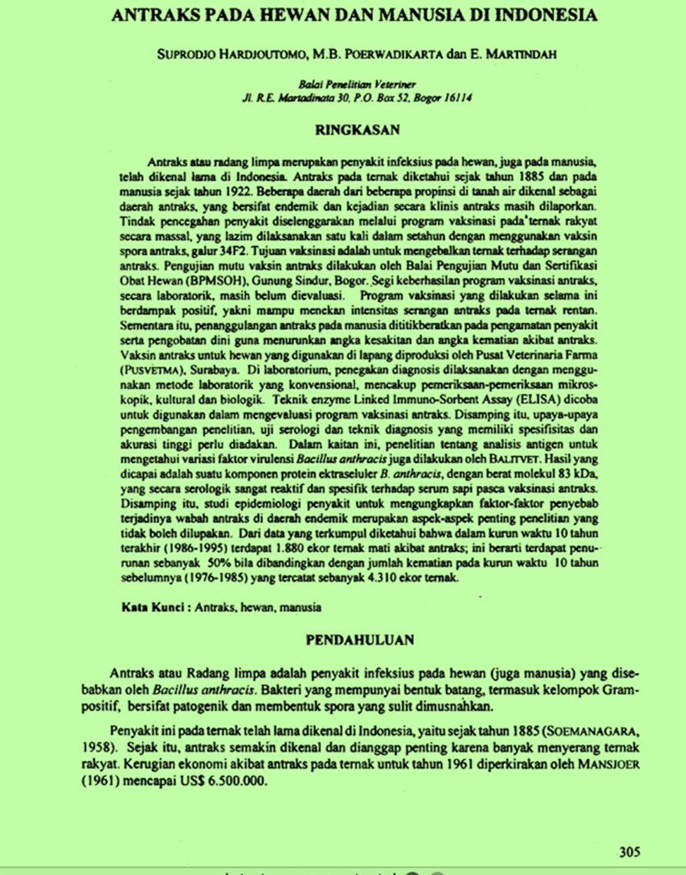 | Judul | Antraks pada hewan dan manusia di Indonesia. / HARDJOUTOMO, Suprodjo; POERWADIKARTA, M. Bhakti; MARTINDAH, Eny(Balai Penelitian Veteriner, Bogor (Indonesia)). |