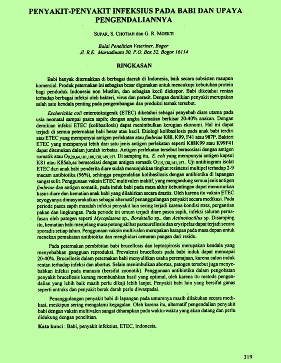 | Judul | Penyakit-penyakit infeksius pada babi dan upaya pengendaliannya. / SUPAR; CHOTIAH, Siti; MOEKTI, GOZALI (Balai Penelitian Veteriner, Bogor (Indonesia)). |