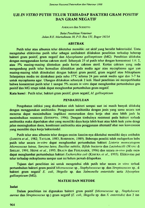| Judul | Uji In Vitro Putih Telur Terhadap Bakteri Gram Positif dan Gram Negatif / Andriani; Soeripto (Balai Penelitian Veteriner, Bogor) |