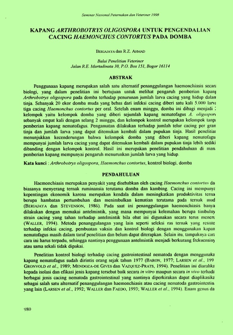 | Judul | Kapang Arthrobotrys oligospora untuk pengendalian cacing Haemonchus contortus pada domba. / Beriajaya; Ahmad, Riza Zainuddin (Balai Penelitian Veteriner, Bogor) |