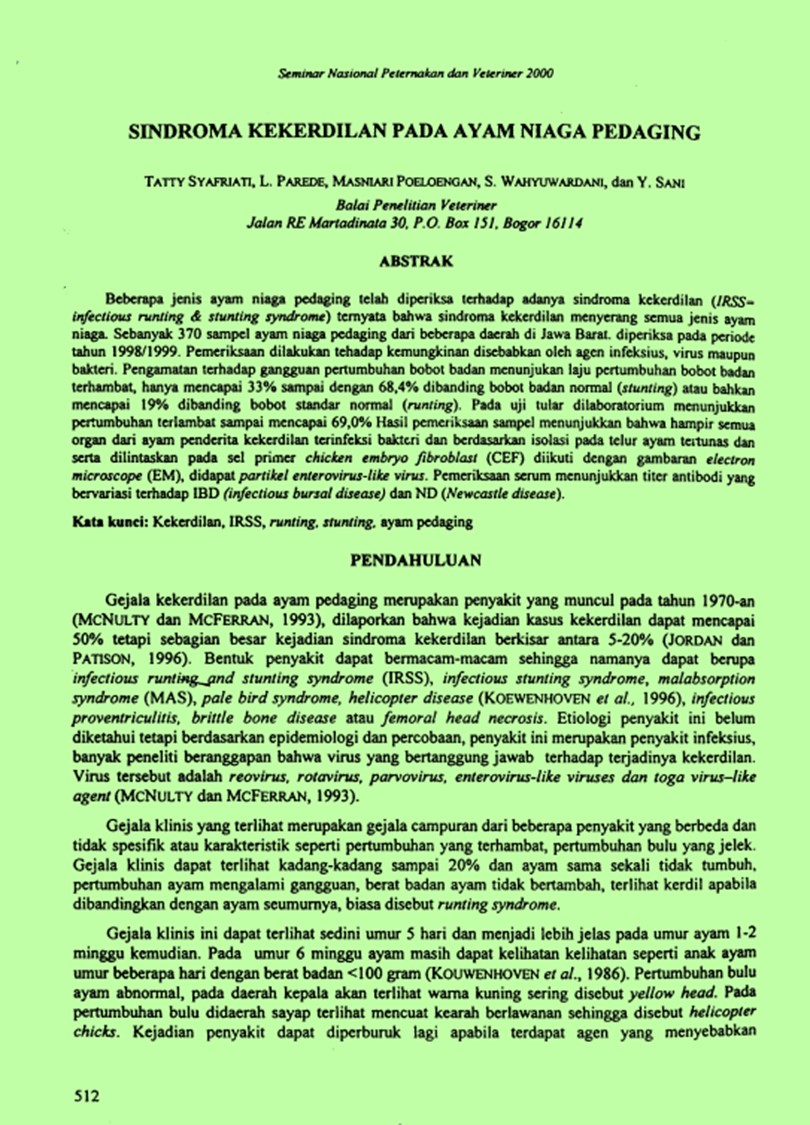 | 245 | # | # | $a Sindroma kekerdilan pada ayam niaga pedaging. /$c Syafriati, Tatty; Parede, Lies; Poeloengan, Masniari; Wahyuwardani, Sutiastuti; Sani, Yulvian(Balai Penelitian Veteriner, Bogor (Indonesia)). |