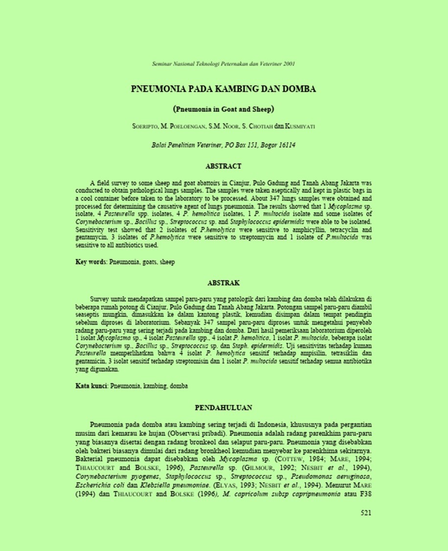 | Judul | Pneumonia pada kambing dan domba. / Soeripto; Poeloengan, Masniari; Noor, Susan Maphilindawati; Chotiah, Siti; Kusmiyati(Balai Penelitian Veteriner, Bogor (Indonesia)). |