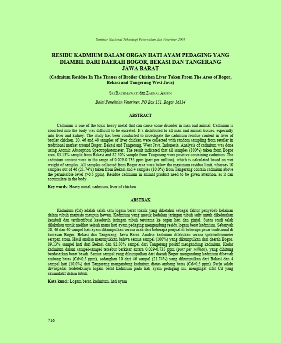 | Judul | Residu kadmium dalam organ hati ayam pedaging yang diambil dari daerah Bogor, Bekasi dan Tangerang Jawa Barat. / Rachmawati, Sri; Arifin, Zainal(Balai Penelitian Veteriner, Bogor (Indonesia)). |