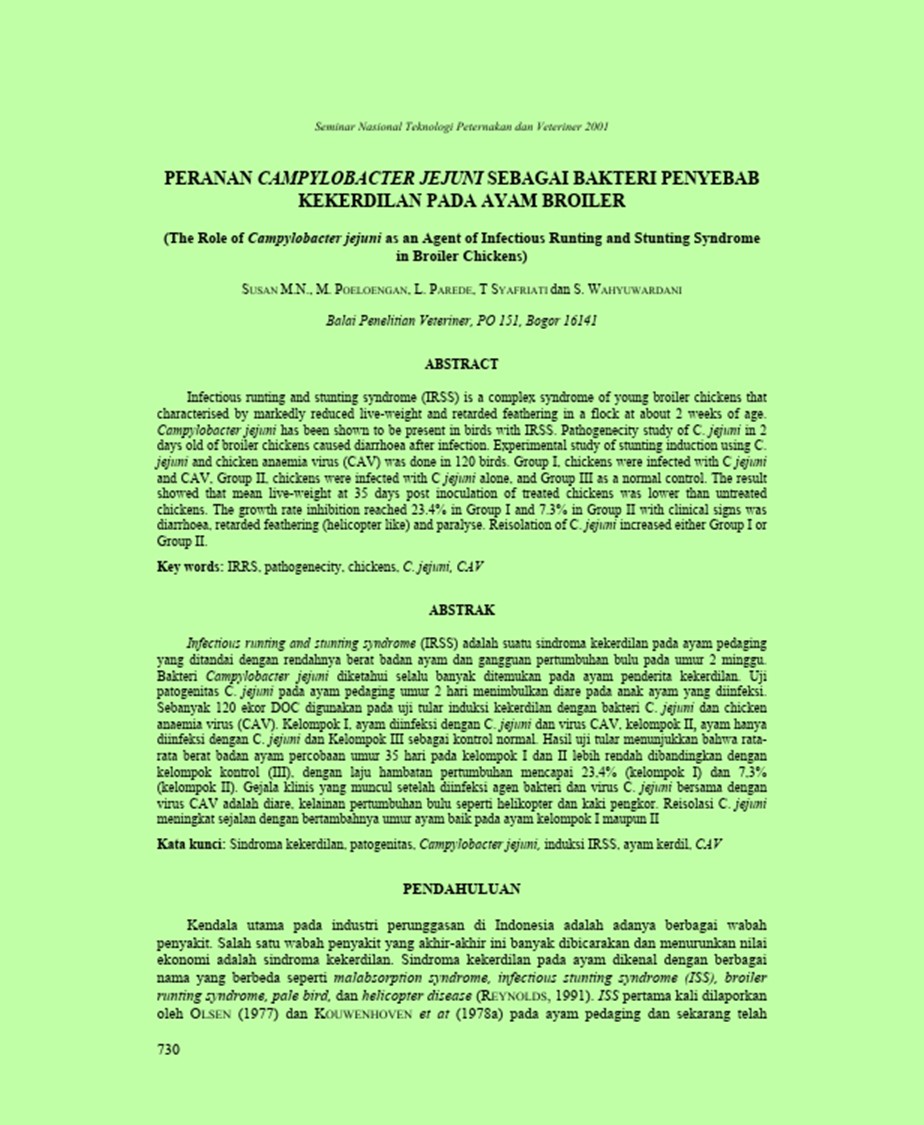 | 245 | # | # | $a Peranan Campylobacter jejuni sebagai bakteri penyebab kekerdilan pada ayam broiler. /$c Noor, Susan Maphilindawati; Poeloengan, Masniari; Parede, Lies; Syafriati, tatty; Wahyuwardani, Sutiastuti(Balai Penelitian Veteriner, Bogor (Indonesia)). |