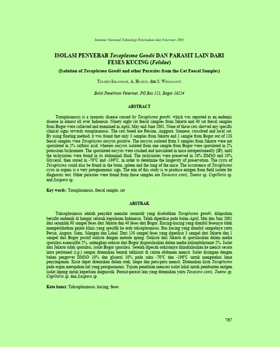 | Judul | Isolasi penyebab Toxoplasma gondii dan parasit lain dari feses kucing (Felidae). / Iskandar, Tolibin; Husein, Amir; Widjajanti, Sri(Balai Penelitian Veteriner, Bogor (Indonesia)). |