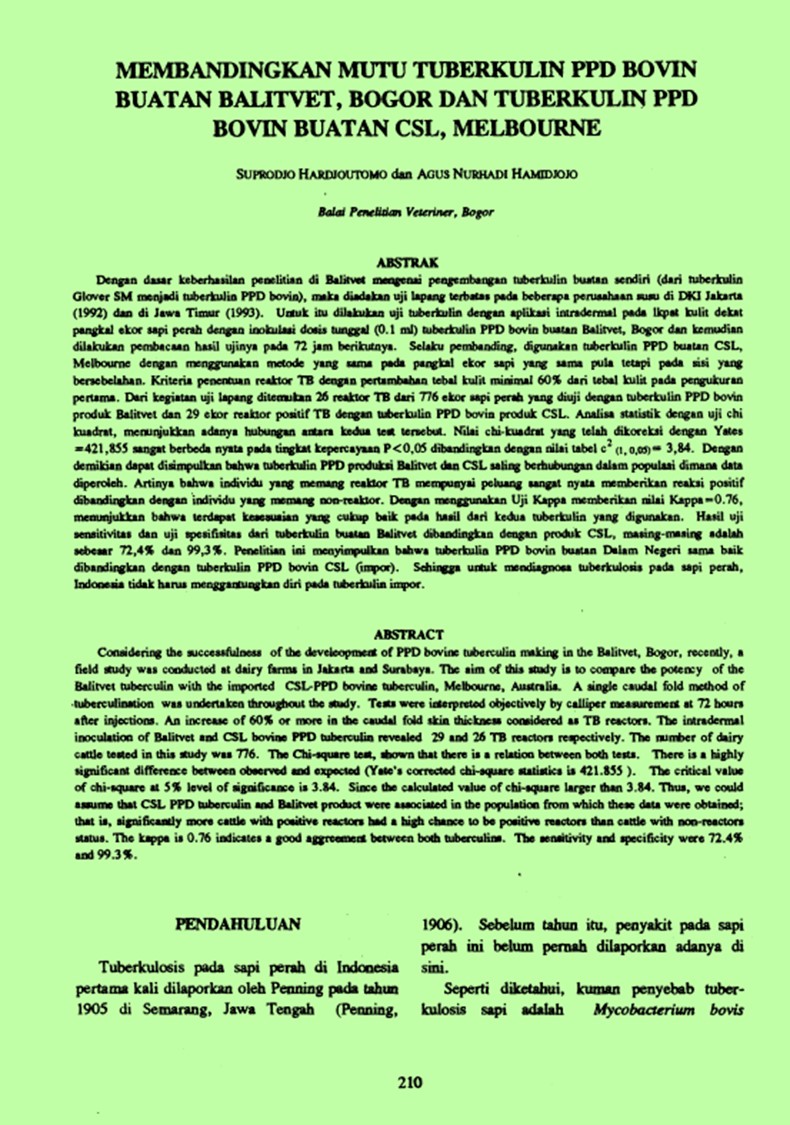 | Judul | Membandingkan mutu tuberkulin PPD bovine buatan balitvet Bogor dan tuberkulin PPD bovine buatan CSL Melbourne. / Hardjoutomo, Suprodjo; Nurhadi, Agus(Balai Penelitian Veteriner, Bogor (Indonesia)). |