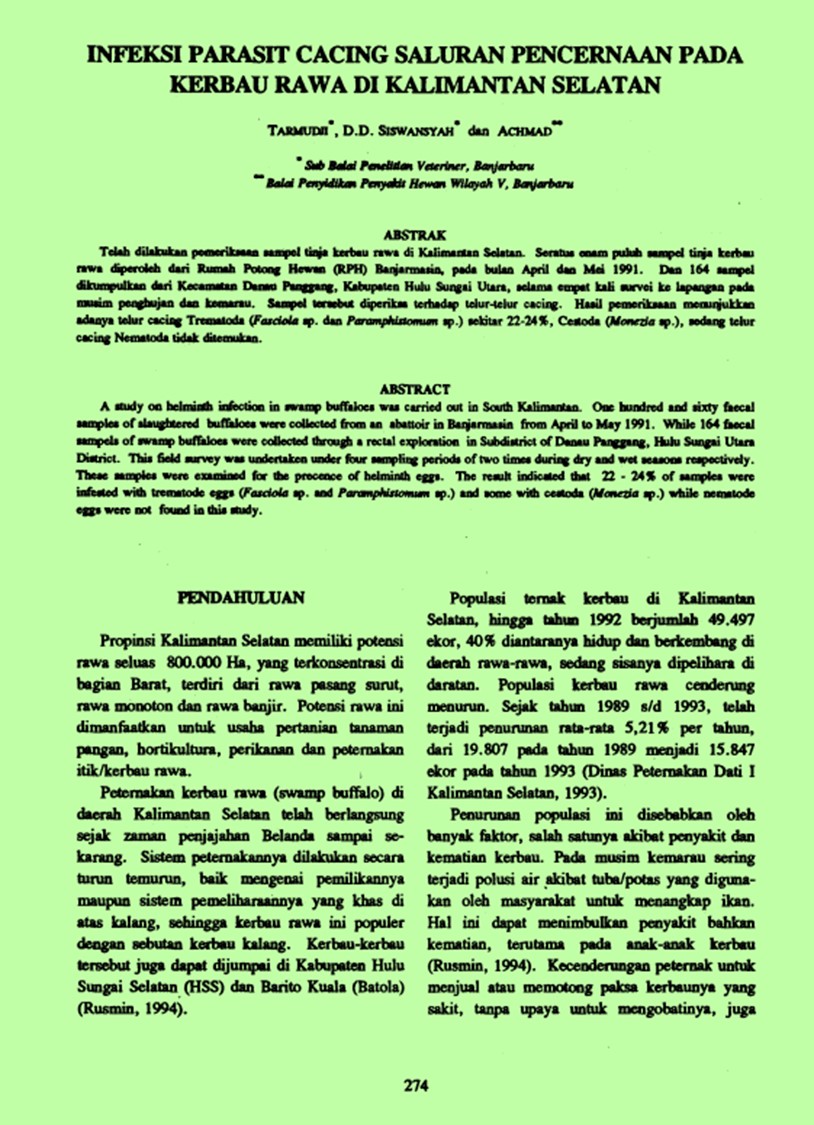 | Judul | Infeksi parasit cacing saluran pencernaan pada kerbau rawa di Kalimantan Selatan. / Tarmudji; Siswansyah, Deddy Djauhari; Achmad(Balai Penelitian Veteriner, Bogor (Indonesia)). |