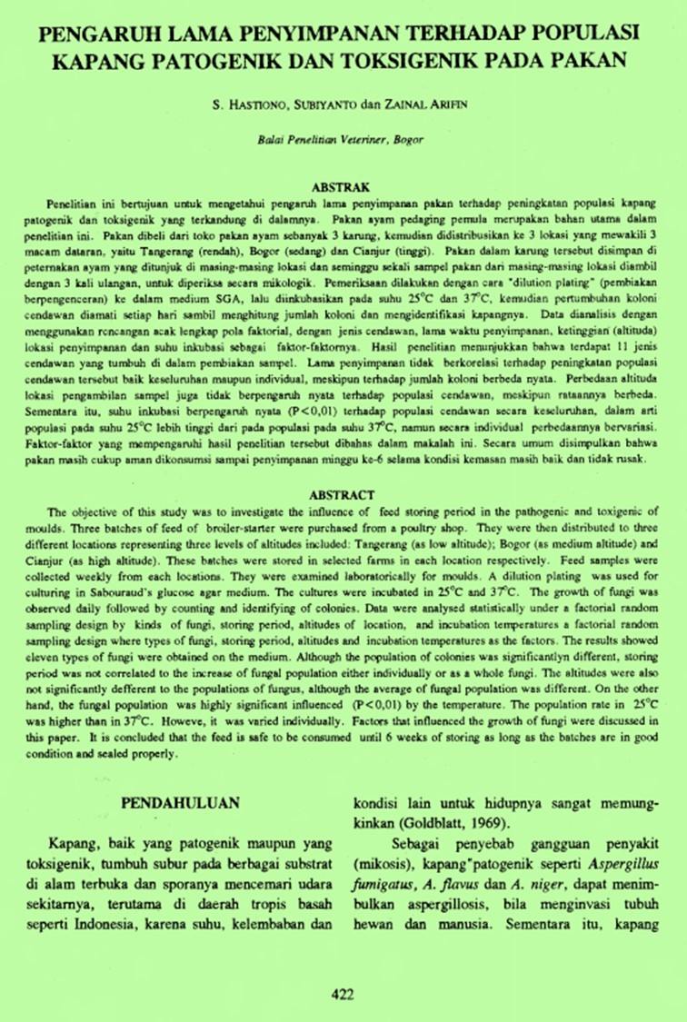 | Judul | Pengaruh lama penyimpanan terhadap populasi kapang patogenik dan toksigenik pada pakan. / Hastiono, Sukardi; Subiyanto; Arifin, Zainal(Balai Penelitian Veteriner, Bogor (Indonesia)). |
