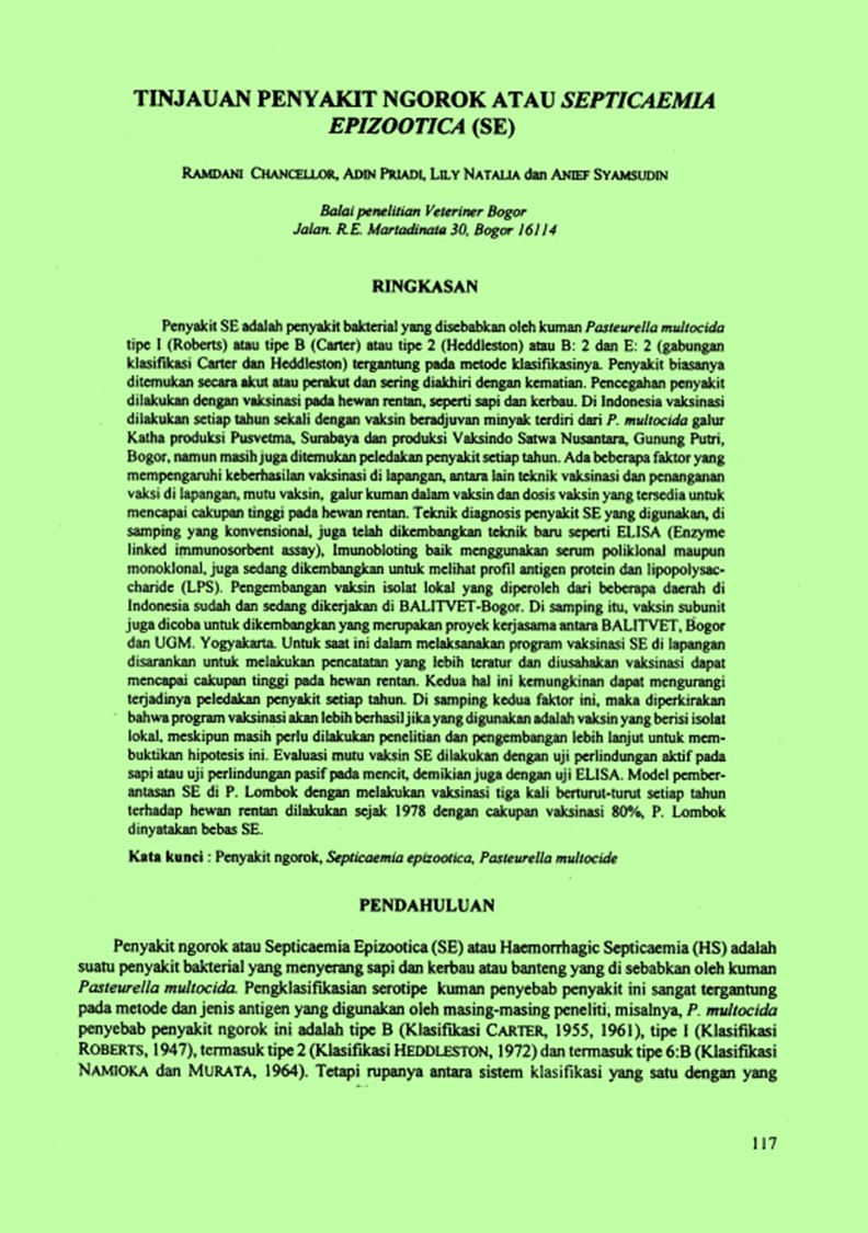 | Judul | Tinjauan penyakit Ngorok atau Septicaemia epizootica (SE). / Chancellor, Ramdani; Priadi, Adin; Natalia, Lily; Syamsudin, Anif(Balai Penelitian Veteriner, Bogor (Indonesia)). |