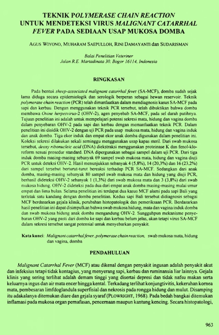 | Pengarang | Saepulloh, Muharam Damayanti, Rini Sudarisman(Balai Penelitian Veteriner, Bogor (Indonesia)). |
