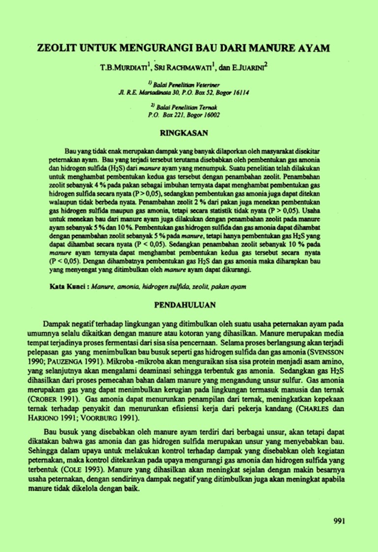 | Judul | Zeolit untuk mengurangi bau dari manure ayam. / Murdiati, Tri Budhi; Rachmawati, Sri(Balai Penelitian Veteriner, Bogor (Indonesia))Juarini(Balai Penelitian Ternak Ciawi). |