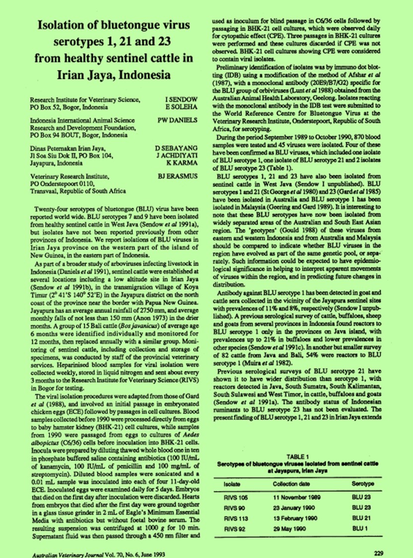 | Judul | Isolation of bluetongue virus serotypes 1, 21 and 23 from healthy sentinel cattle in Irian Jaya, Indonesia. / Sendow, Indrawati; Soleha, E.(Balai Penelitian Veteriner, Bogor (Indonesia))Daniels, Peter W.(Indonesia International Animal Science Research and Development Foundation, Bogor Indonesia)Sebayang, D.; Achdijati, Jajuk; Karma, K.(Dinas Peternakan Irian Jaya |