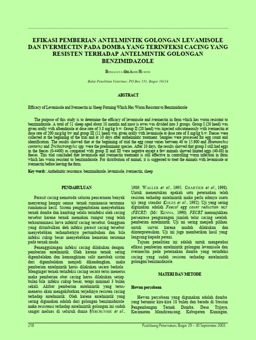 | Judul | Efikasi pemberian antelmintik golongan levamisole dan ivermectin pada domba yang terinfeksi cacing yang resisten terhadap antelmintik golongan benzimidazole. / Beriajaya; Husein, Amir(Balai Penelitian Veteriner, Bogor (Indonesia)). |