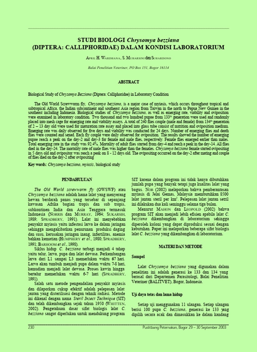 | Judul | Studi biologi Chrysomya bezziana (Diptera: Calliphoridae) dalam kondisi laboratorium. / Wardhana, April H.; Muharsini, Sri; Suhardono(Balai Penelitian Veteriner, Bogor (Indonesia)). |