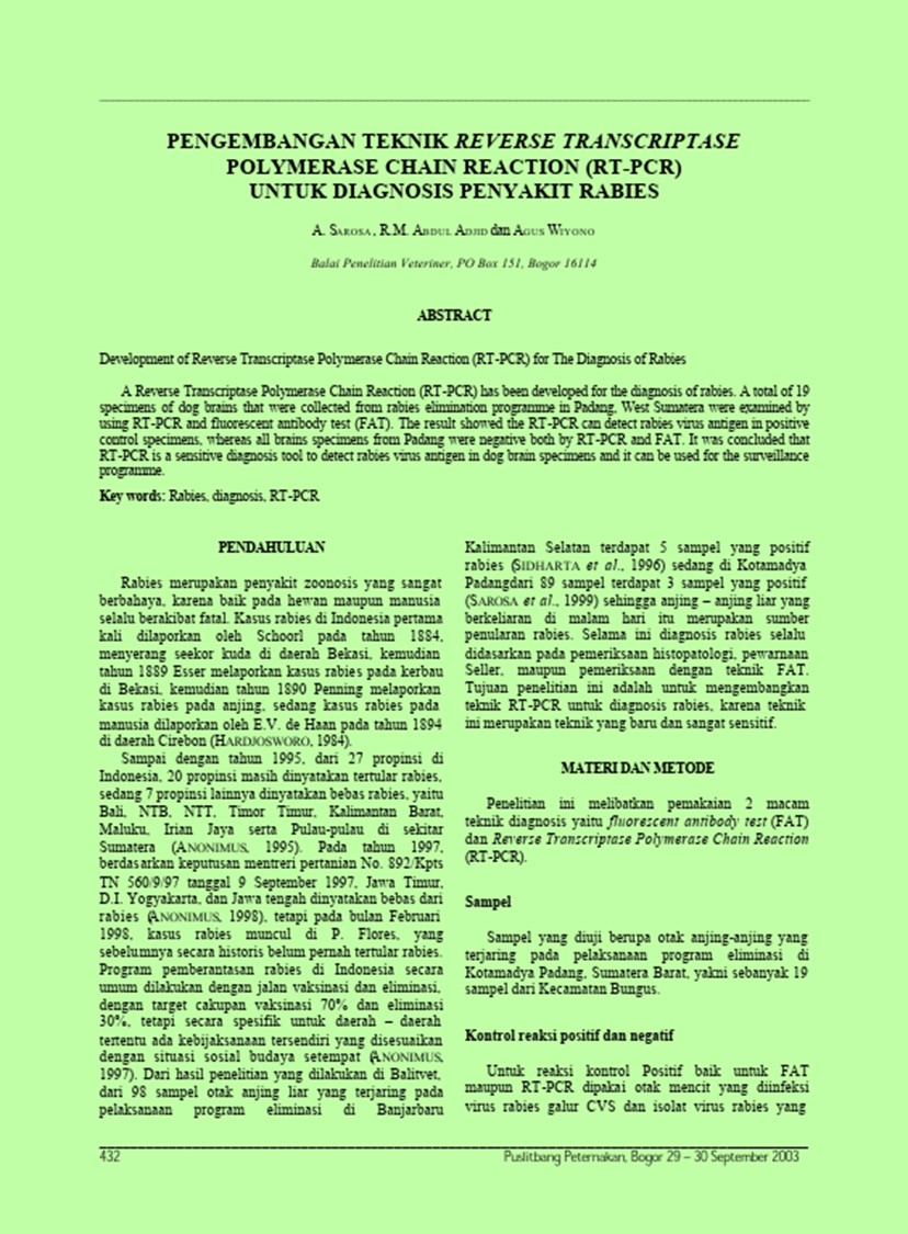 | Judul | Pengembangan teknik Reverse Transcriptase Polymerase Chain Reaction (RT-PCR) untuk diagnosis penyakit rabies. / Sarosa, Antonius; Adjid, R.M. Abdul; Wiyono, Agus(Balai Penelitian Veteriner, Bogor (Indonesia)). |