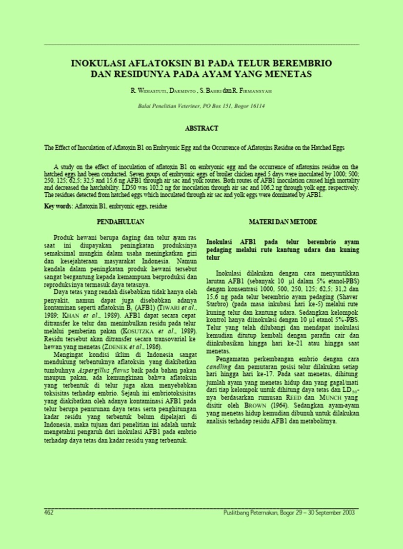 | Judul | Inokulasi aflatoksin B1 pada telur berembrio dan residunya pada ayam yang menetas. / Widiastuti, Raphaela; Darminto; Bahri, Sjamsul; Firmansyah, Rahmat(Balai Penelitian Veteriner, Bogor (Indonesia)). |