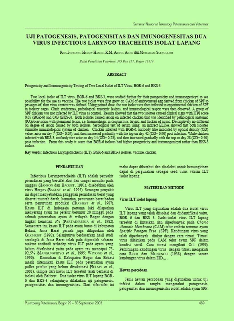 | Pengarang | Hamid, Helmy Adjid, R.M. Abdul Saepulloh, Muharam(Balai Penelitian Veteriner, Bogor (Indonesia)). |