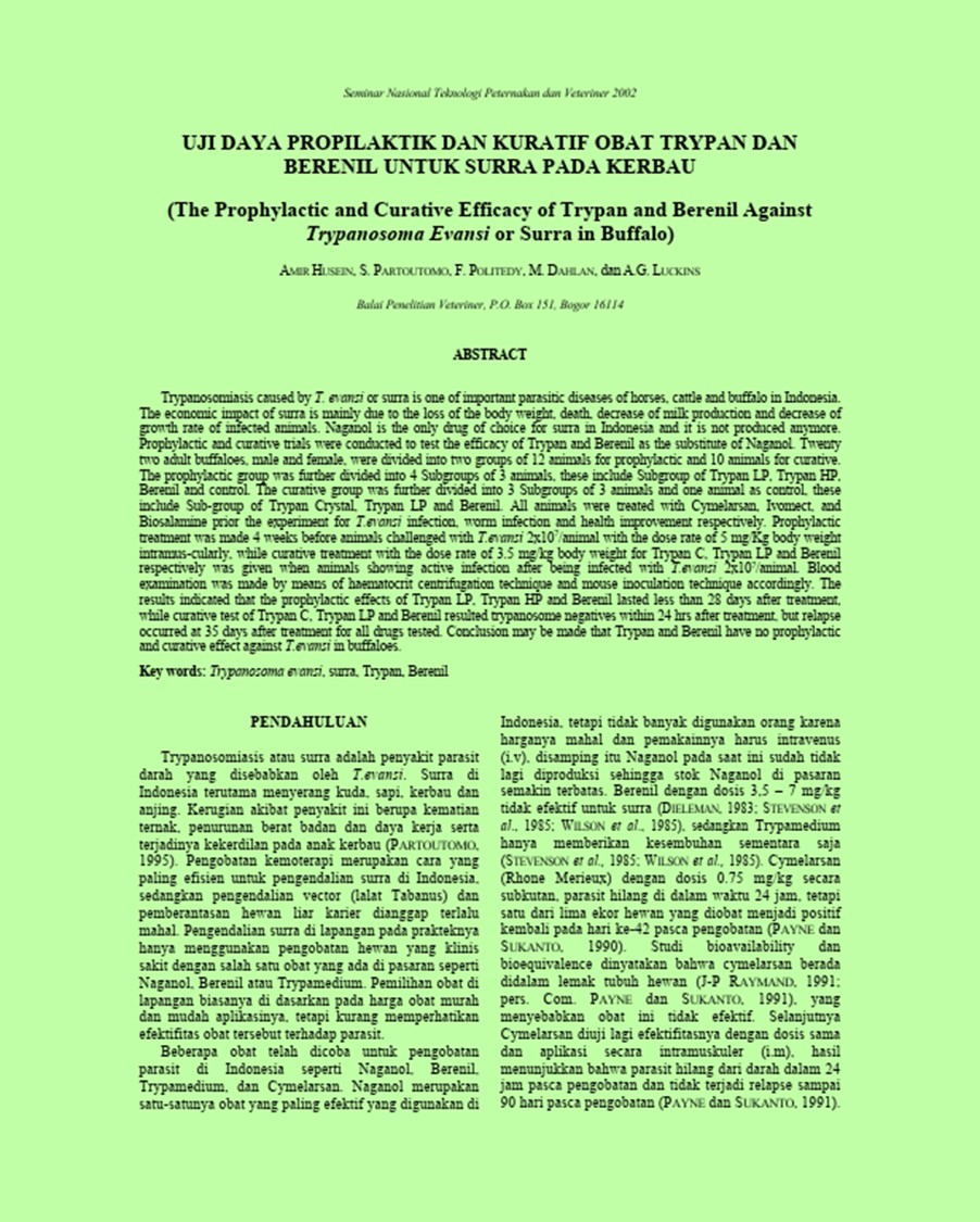 | Judul | Uji daya propilaktik dan kuratif obat trypan dan berenil untuk surra pada kerbau. / Husein, Amir; Partoutomo, Sutijono; Politedy, F.; Dahlan, Mukhamad; Luckins, A.G.(Balai Penelitian Veteriner, Bogor (Indonesia)). |