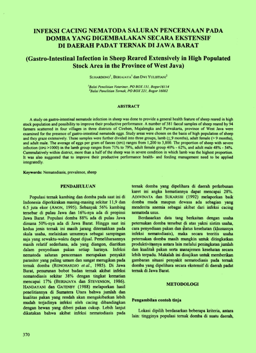 | Judul | Infeksi cacing nematoda saluran pencernaan pada domba yang digembalakan secara ekstensif didaerah padat ternak di Jawa Barat. / Suhardono; Beriajaya; Yulistiani, Dwi(Balai Penelitian Veteriner, Bogor (Indonesia)). |