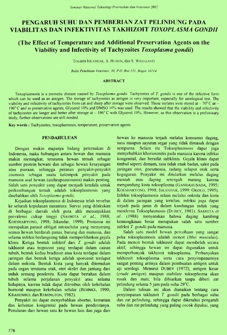 | Judul | Pengaruh suhu dan pemberian zat pelindung pada viabilitas dan infektivitas takhizoit Toxoplasma gondii. / Iskandar, Tolibin; Husein, Amir; Widjajanti, Sri(Balai Penelitian Veteriner, Bogor (Indonesia)). |