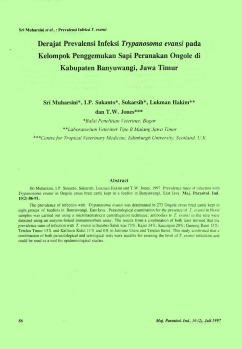 | Judul | Derajat prevalensi infeksi Trypanosoma evansi pada kelompok penggemukan sapi peranakan ongole di Kabupaten Banyuwangi, Jawa Timur / Muharsini, Sri; Sukanto, Ismu Prastyawati; Hakim, Lukman; Jones, T. W. |
