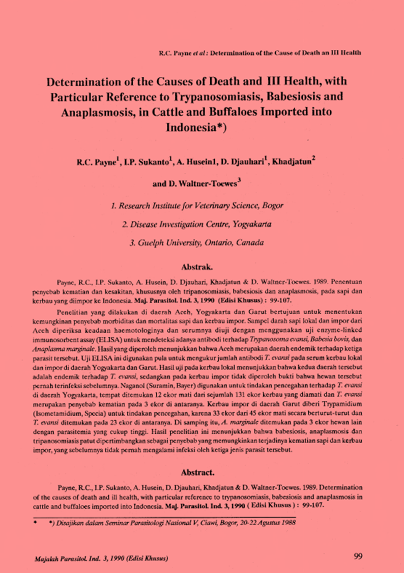 | Judul | Determination of the causes of death and III health, with particular reference to Trypanosomiasis, Babesiosis and Anaplasmosis, in cattle and buffaloes imported into Indonesia. / Payne, R.C.; Sukanto, Ismu Prastyawati; Husein, Amir; Djauhari, Deddy(Balai Penelitian Veteriner, Bogor (Indonesia))Khadjatun(Disease Investigation Centre, Yogyakarta)Waltner-Toewes, D.(Guelph University, Ontario, Canada). |